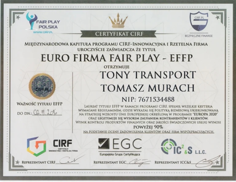 Nasza firma, Tony Bus, posiada szeroki zakres certyfikatów i licencji, które stanowią potwierdzenie naszej profesjonalności i wiarygodności. Dzięki tym dokumentom, możemy zapewnić naszym klientom wysoką jakość usług transportowych, zgodne z najnowszymi przepisami i standardami branżowymi. Posiadamy kompletny zestaw niezbędnych certyfikatów, które upoważniają nas do prowadzenia legalnej działalności na terenie Polski i poza jej granicami. Te dokumenty zostały uzyskane na podstawie spełnienia rygorystycznych wymogów i regulacji, co dowodzi naszej zdolności do profesjonalnego świadczenia usług transportowych. Nasze certyfikaty są świadectwem naszej wiedzy, doświadczenia i zaangażowania w branży transportowej. Dzięki nim, nasi klienci mogą mieć pełne zaufanie do naszej firmy i być pewni, że korzystają z usług renomowanego i legalnie działającego przewoźnika. Jesteśmy dumni z naszych certyfikatów, które obejmują różne aspekty naszej działalności, takie jak bezpieczeństwo, jakość usług, zarządzanie flotą i przestrzeganie przepisów. To potwierdzenie naszych wysokich standardów i zobowiązania do zapewnienia satysfakcji klientów. Dzięki naszym certyfikatom, możemy świadczyć usługi transportowe na najwyższym poziomie, zgodnie z wymogami rynku i potrzebami naszych klientów. Nasza firma Tony Bus jest gotowa sprostać wszelkim wyzwaniom związanym z transportem i zapewnić Państwu bezpieczne, komfortowe i niezawodne przewozy.